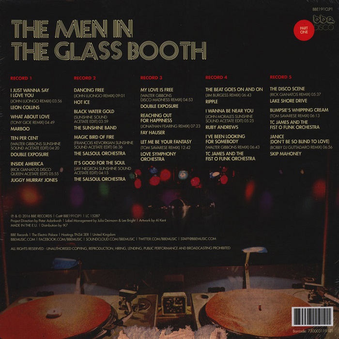The Men In The Glass Booth compiled by Al Kent tells the full story. Featuring ground breaking re-edits and remixes by some of the Disco era’s most influential DJs including Walter Gibbons, Bobby DJ Guttadaro, Tom Savarese, Jellybean Benitez, Tee Scott and John Luongo, this opulent release also includes a 40 page book (Vinyl Box Part A / CD) which features exclusive photos and insights from some of the story’s key figures.” BBE Music 2017