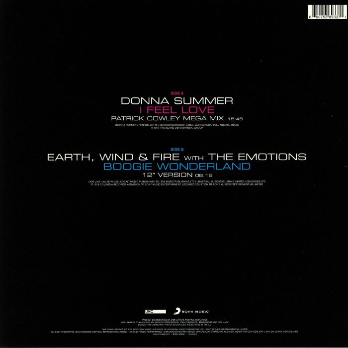 In 1982, Donna Summer’s ‘I Feel Love’ – which had re-defined dance music on its original release in 1977 – was remixed by Patrick Cowley and became a huge dance floor anthem once again. The extended “Mega Mix” version, running to over 15 mins, has long been celebrated as one of the most essential dance music cuts of all time and now, for the first time since its original release, we are proud to reissue this amazing track as a 12” single. And to make this the best 12” single you could ever own, we have coupled ‘I Feel Love’ with another towering classic of the genre. From 1979 we present the full 8-minute plus version of the breath-taking ‘Boogie Wonderland’ by Earth, Wind & Fire with The Emotions. One of the best loved disco tracks of all time – and in its extended version here – not only is it a huge floor filler but it’s also a truly euphoric celebration in music.